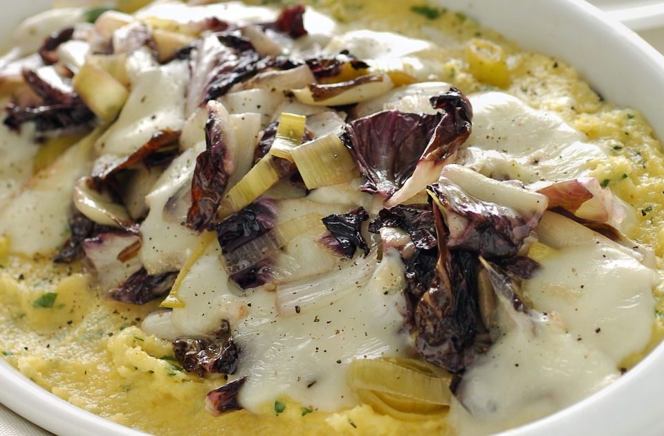 Tortino di polenta con speck, radicchio e fonduta di Asiago